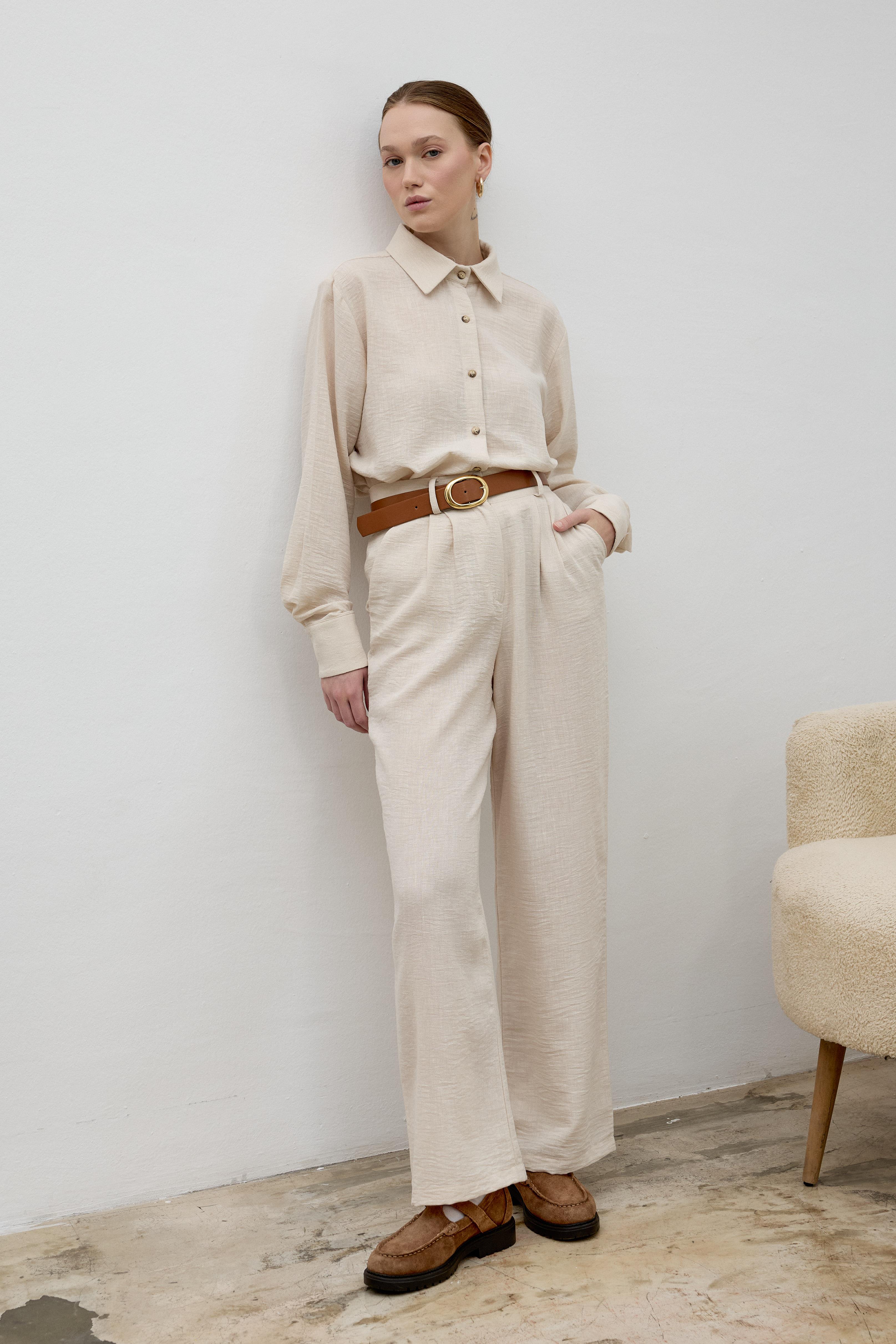 Kırışık dokulu keten kumaştan üretilen bu pantolon, hafif yapısı ve nefes alan dokusuyla gün boyu konfor sağlar. Ketenin kendine has dokusu ve kırışık formu, pantolona özgün bir karakter ve rahat bir zarafet kazandırır. Günlük şehir stilinden tatil kombinlerine kadar her ortamda farklı üstlerle kolayca kombinlenebilir ve zamansız bir stil sunar.