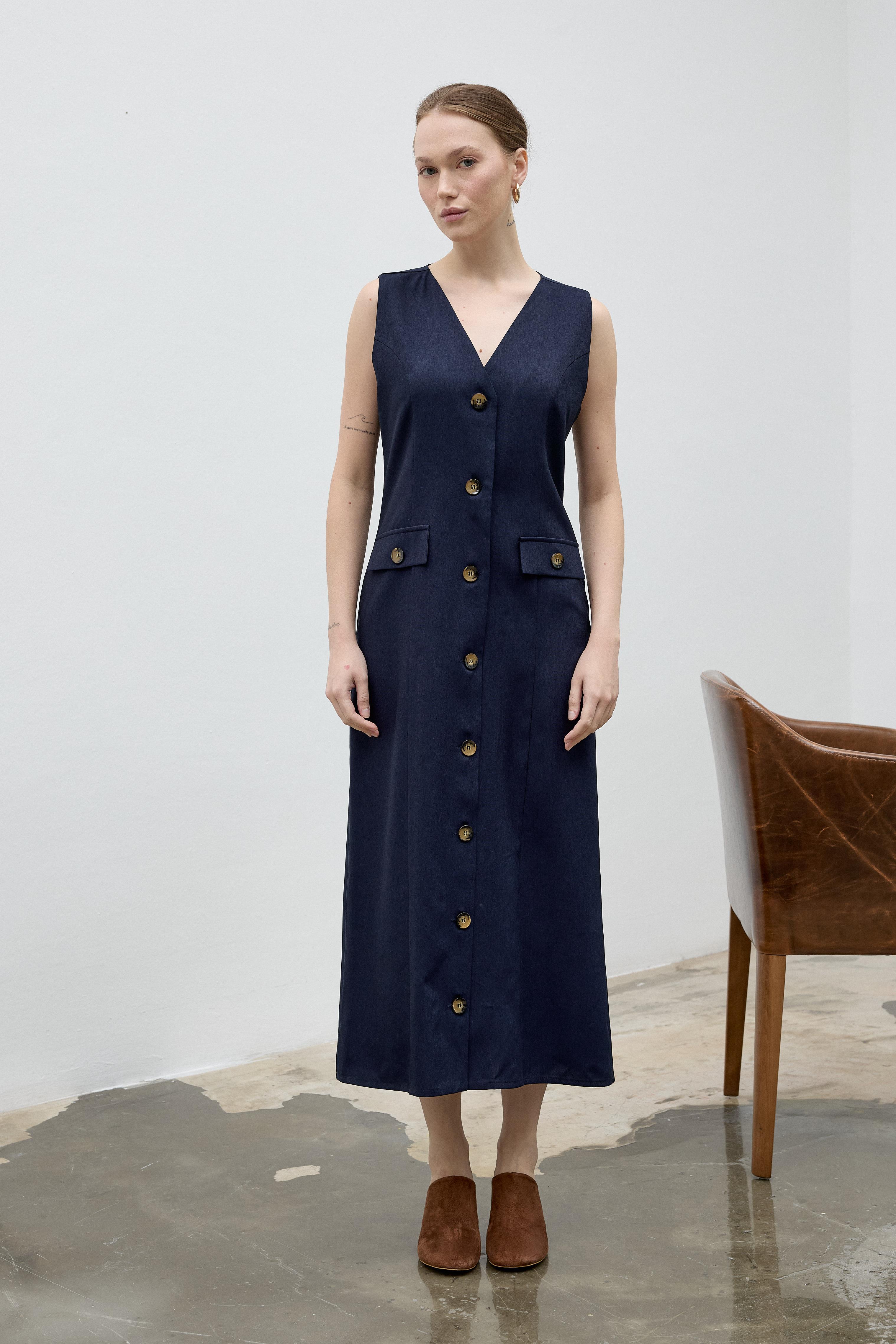 Mila midi boy jile, V yaka ve önden düğme detayları ile feminen bir görünüm kazandırır. Midi boy uzunluğu ve dökümlü yapısı sayesinde rahat bir kullanım sağlarken, şıklığıyla hem günlük stilinize hem de özel kombinlerinize uyum sağlar. Klasik çizgileri ile gardırobunuzun vazgeçilmez parçalarından biri olmaya adaydır.