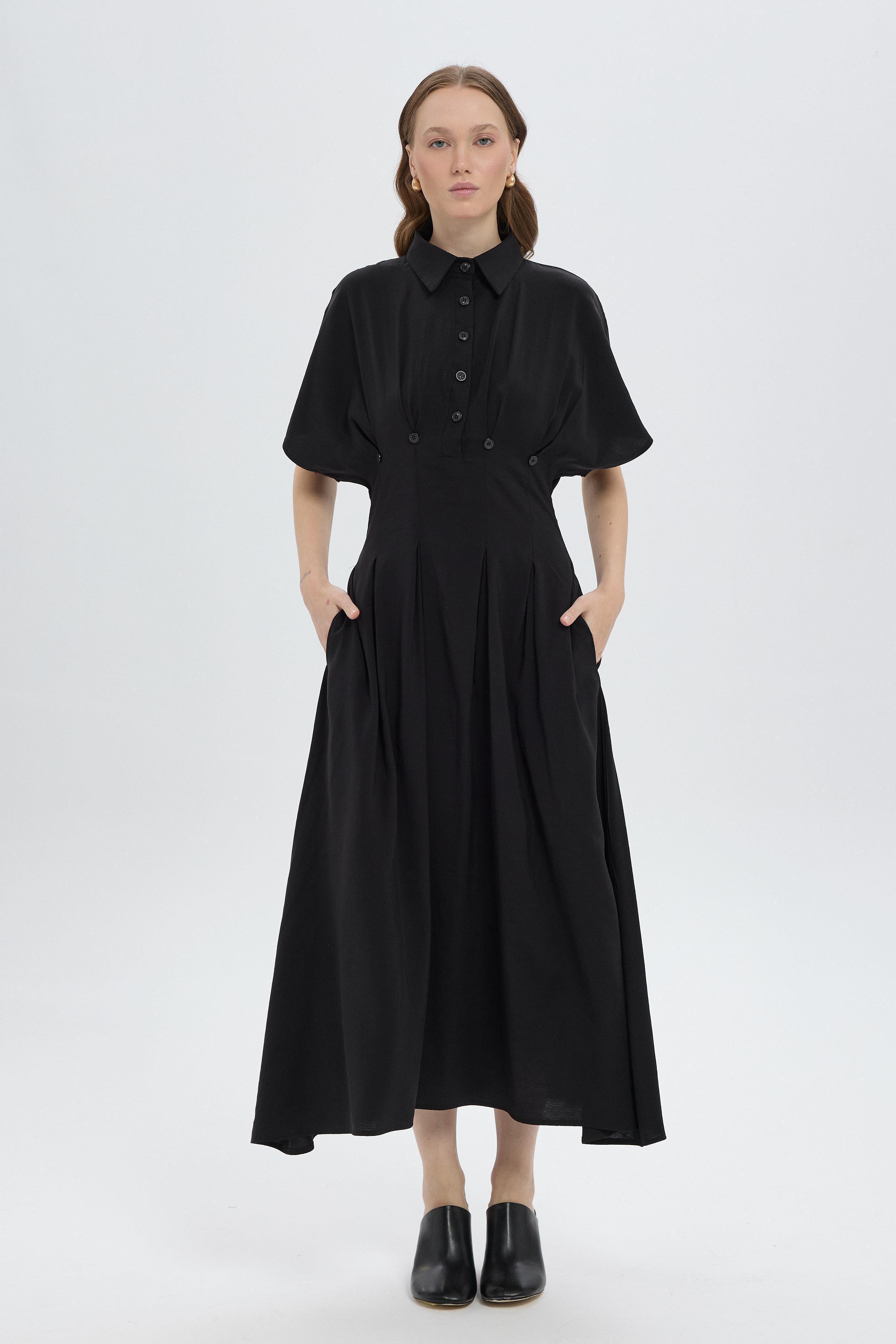 Siyah Vera midi elbise, belden oturan formu ile hatları nazikçe vurgular ve feminen bir siluet yaratır. Düğme detayları ve gizli fermuar sayesinde pratik bir kullanım sağlarken, ipeksi yumuşak dokulu kumaşı gün boyu veya akşam kombinlerinde konfor sunar. Midiboy boyu ile hem günlük hem de özel davetlerde stilinize sofistike bir dokunuş katacak, gardırobunuzun zamansız parçalarından biri olarak öne çıkar.