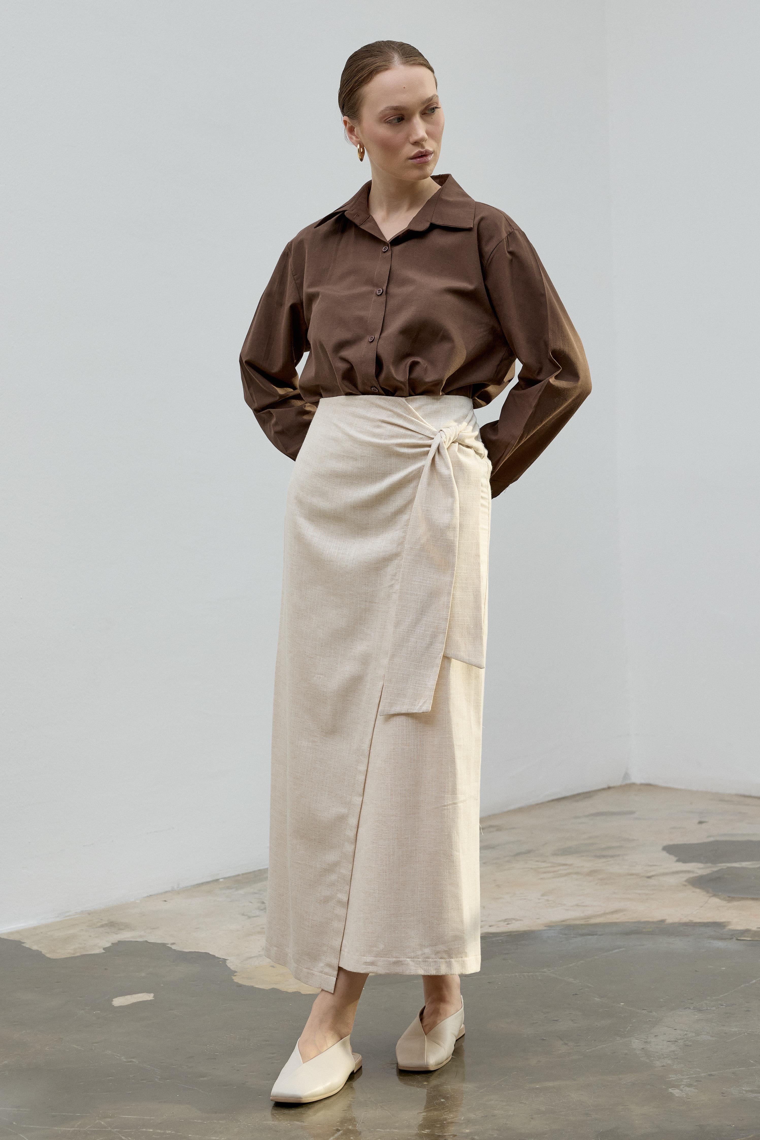 Doğal dokusu ve özgün kesimiyle zamansız bir şıklık sunan bu etek, sade ama etkileyici bir stilin anahtar parçası.