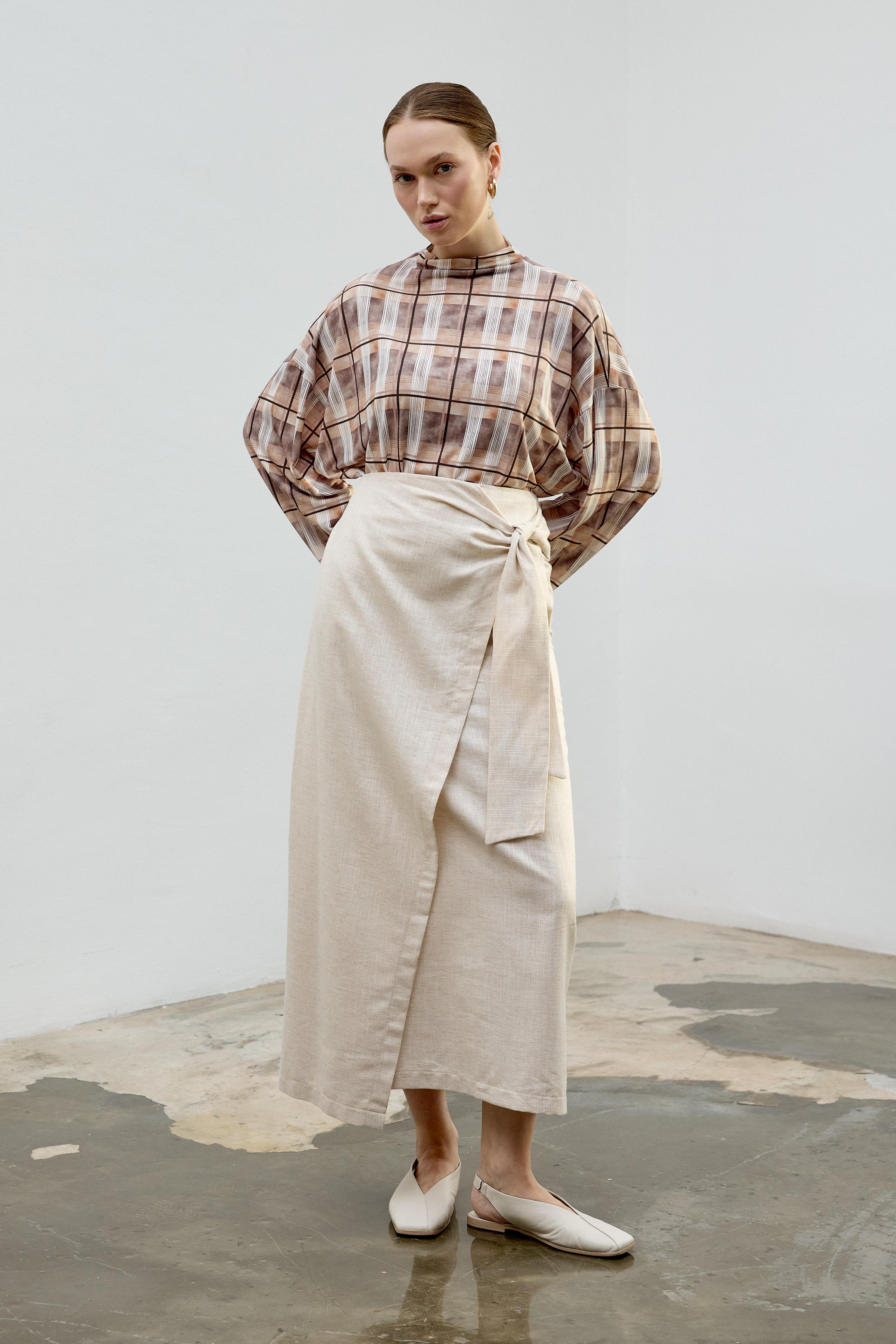 Doğal dokusu ve özgün kesimiyle zamansız bir şıklık sunan bu etek, sade ama etkileyici bir stilin anahtar parçası.