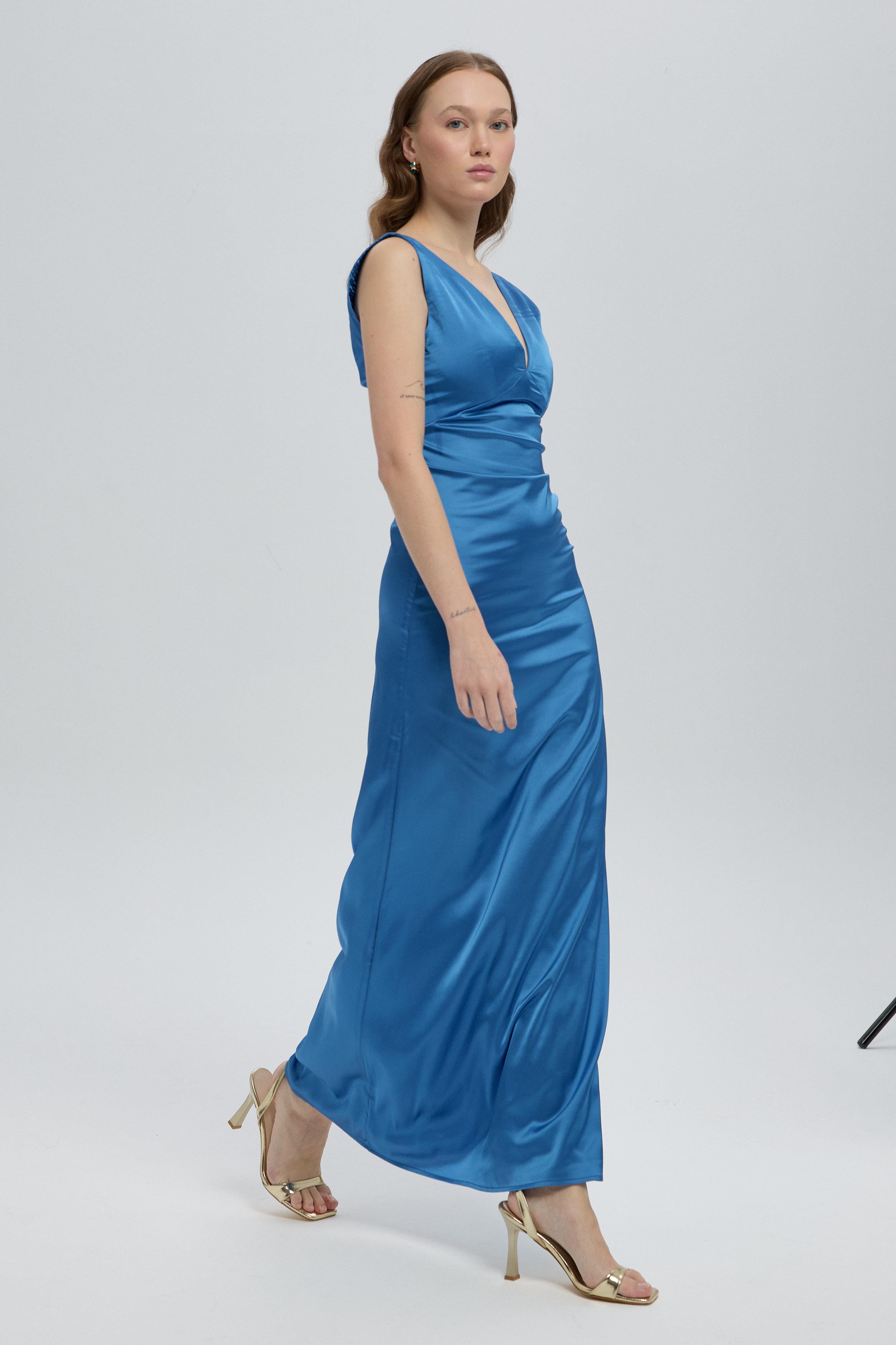 Mavi saten dokusuyla göz alıcı bir parlaklığa sahip bu elbise, derin göğüs dekoltesi ve sırt dekoltesi ile cesur ve zarif bir siluet sunar. Sırtta yer alan pencere detayı, modern ve çekici bir dokunuş katar. Uzun boyu ve akıcı saten kumaşıyla her adımda hareket ederken, özel davet ve gece etkinliklerinde öne çıkmanızı sağlar.