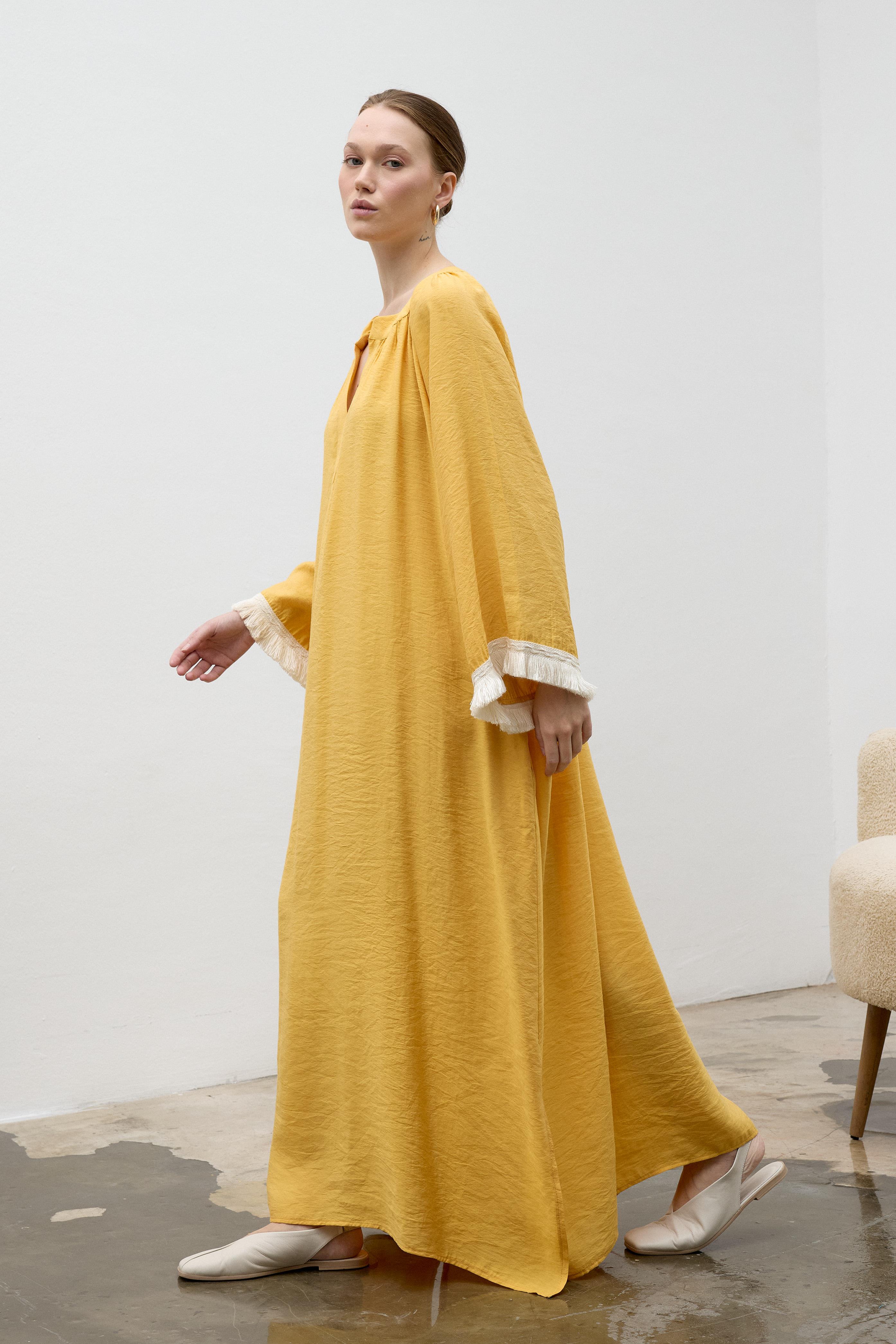 Kendinden kırışık, ipeksi kumaştan üretilen bu bol dökümlü elbise, hafif ve akıcı yapısıyla gün boyu konfor sağlar. V yaka detayı, omuz ve dekolte hattını zarifçe vurgularken, kol uçlarındaki güpür detayları elbiseye sofistike ve romantik bir dokunuş ekler. Hem günlük stilinizde hem de özel davetlerde rahatlıkla kullanabileceğiniz, modern ve zarif bir parçadır.