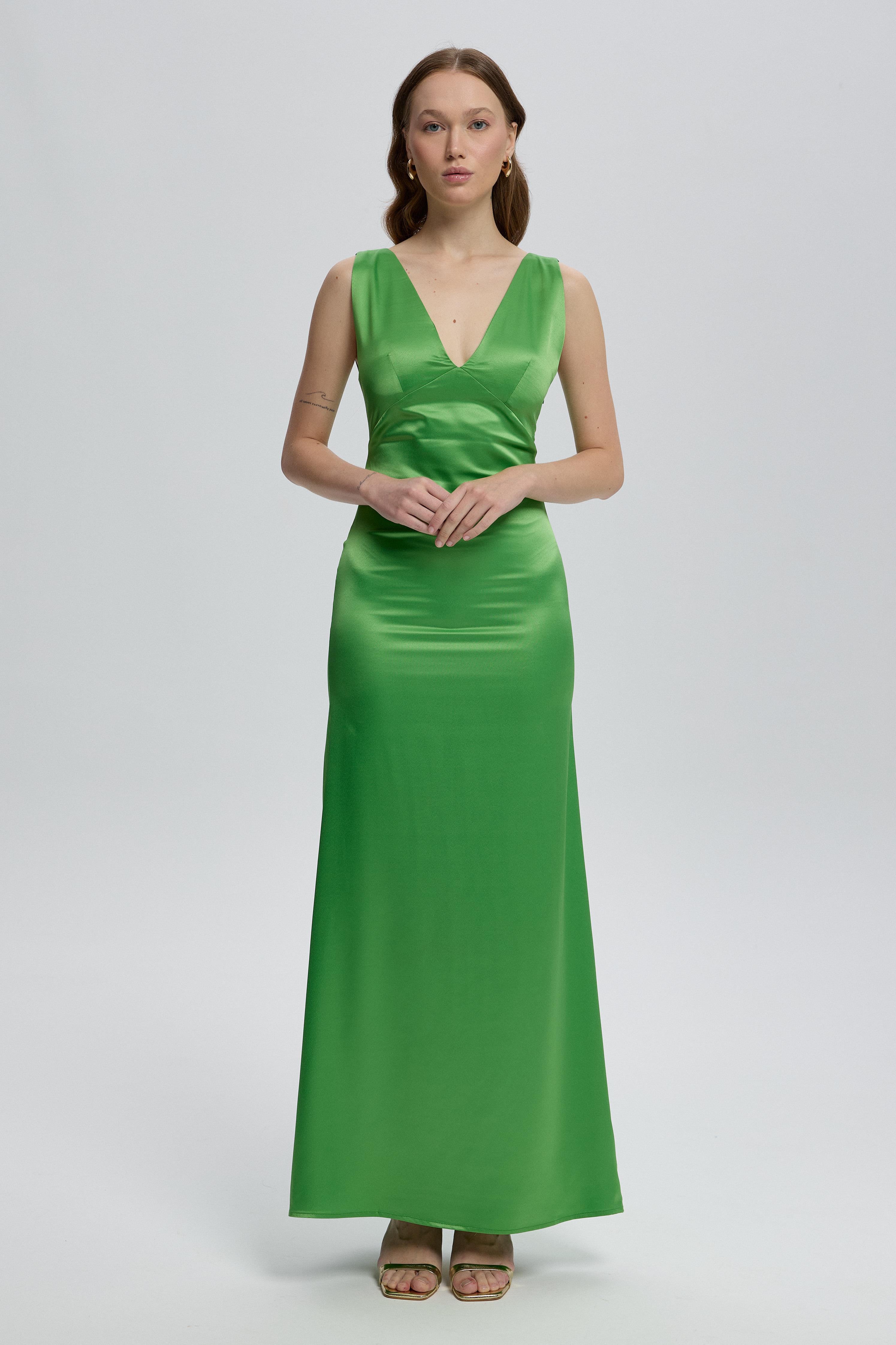 Yeşil saten dokusuyla göz alıcı bir parlaklığa sahip bu elbise, derin göğüs dekoltesi ve sırt dekoltesi ile cesur ve zarif bir siluet sunar. Sırtta yer alan pencere detayı, modern ve çekici bir dokunuş katar. Uzun boyu ve akıcı saten kumaşıyla her adımda hareket ederken, özel davet ve gece etkinliklerinde öne çıkmanızı sağlar.